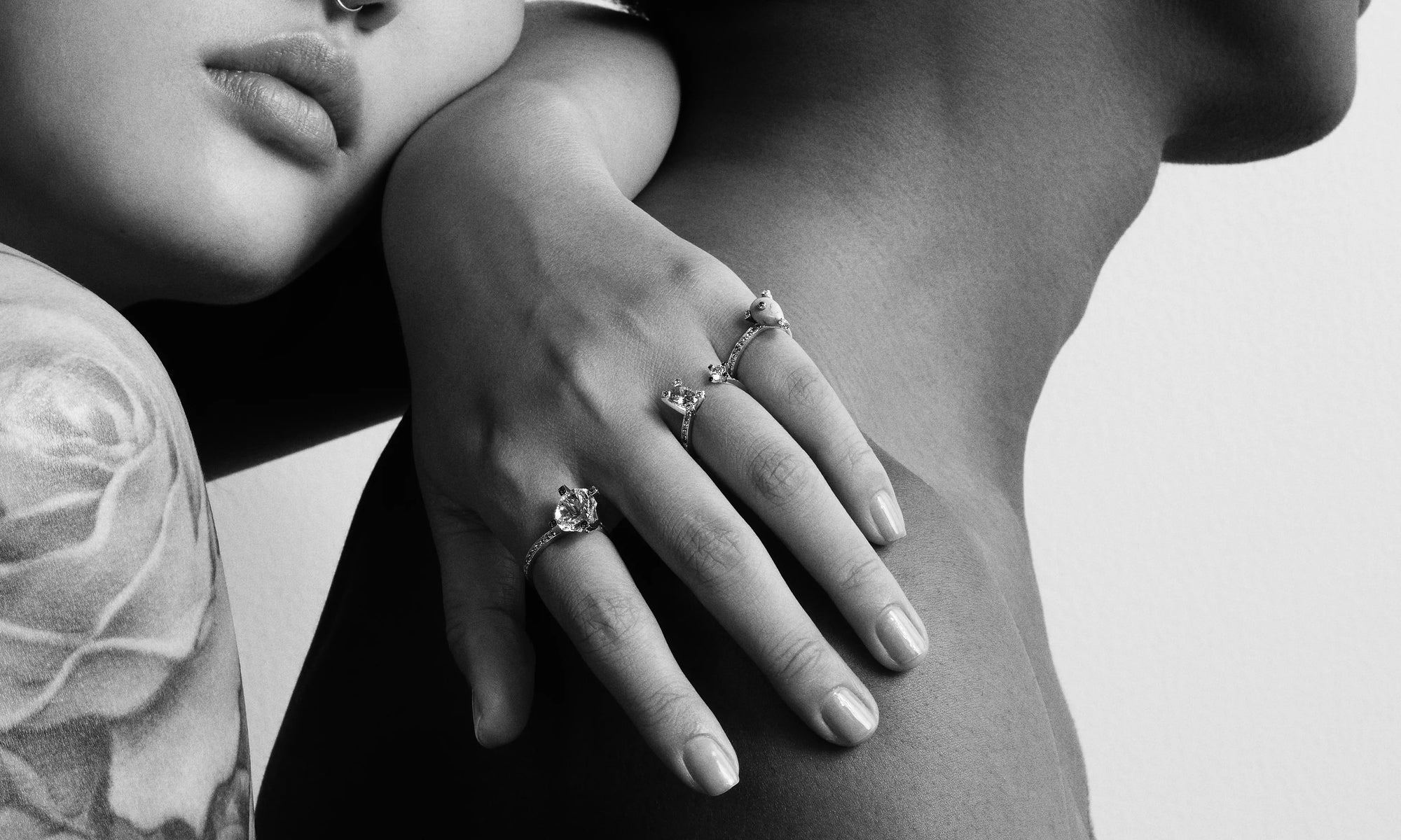Evolution of Rock Collection Inspired by the multi-facets of a diamond, this collection combines the raw, the linear and the three dimensional; reinventing promise rings and engagement rings with two diamonds symbolizing the love bond of two; one for him and one for her, defying the conventional techniques of Jewelry making with the side rock as her signature collection.